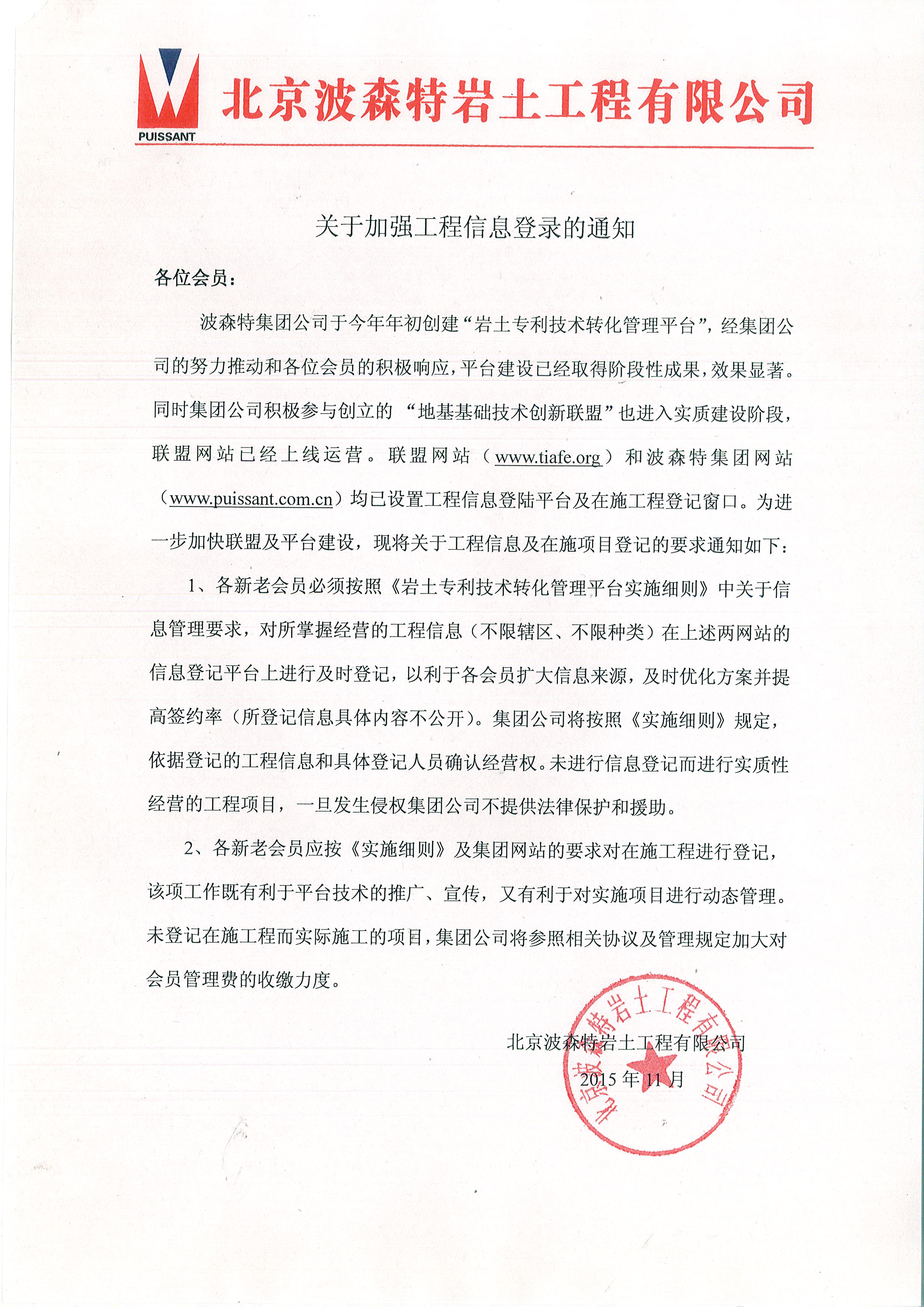 联盟网站(www.tiafe.org)和波森特集团网站(www.puissant.com.cn)均已设置工程信息登陆平台及在施工程登记窗口。为进一步加快联盟及平台建设,现将关于工程信息及在施项目登记的要求通知如下: